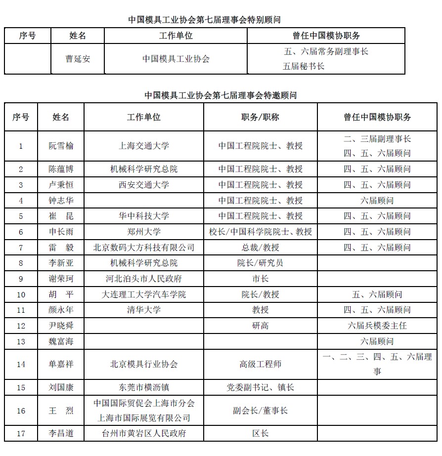 中國模具工業(yè)協(xié)會(huì )第七屆理事會(huì )特別顧問(wèn)、特邀顧問(wèn)名單