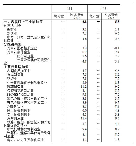 分經(jīng)濟類(lèi)型看,3月份,國有控股企業(yè)增加值同比增長(cháng)3.2%;集體企業(yè)增長(cháng)0.2%,股份制企業(yè)增長(cháng)7.6%,外商及港澳臺商投資企業(yè)增長(cháng)4.8%。