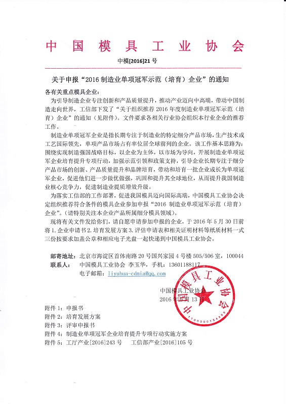 關(guān)于申報“2016制造業(yè)單項冠軍示范(培育)企業(yè)”的通知