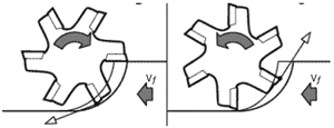 在高效切削加工中,應盡量選用順銑加工,因為在順銑時(shí),刀具剛切入工件產(chǎn)生的切屑厚度為最大,隨后逐漸減小。在逆銑時(shí),刀具剛切入工件產(chǎn)生的切屑厚度為最小,隨后逐漸增厚,這樣增加了刀具與工件的摩擦,在刀刃上產(chǎn)生大量熱,所以在逆銑中產(chǎn)生的熱量比在順銑時(shí)多很多,徑向力也大大增加,緩解了高硬度切削時(shí)切削熱對刀具的損傷。同時(shí)在逆銑中刀刃受力狀態(tài)較順銑更為惡劣,降低了刀片的使用壽命,順銑和逆銑時(shí)刀具切入工件的過(guò)程,如圖(二)所示。