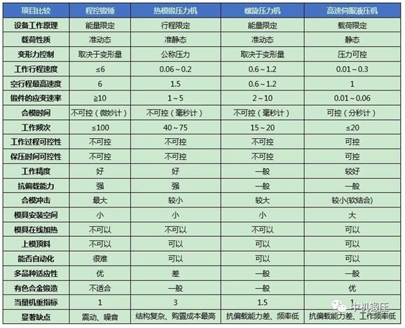二、幾種熱鍛成形設備工藝參數及性能比較