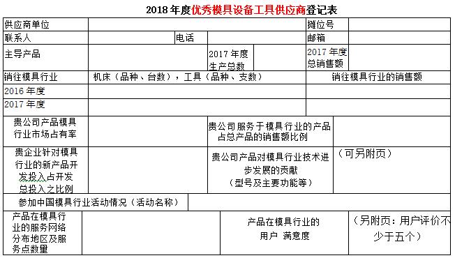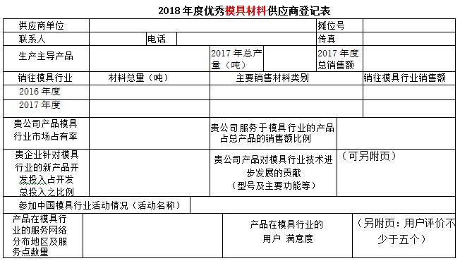 現代模具工業(yè)是高技術(shù)背景下的資金和技術(shù)密集型工業(yè)。隨著(zhù)模具行業(yè)的發(fā)展,現代模具要實(shí)現數字化設計、數字化制造、數字化管理、數字化生產(chǎn)流程來(lái)實(shí)現模具工業(yè)的現代化。模具材料是降本提質(zhì)增效的重要至關(guān)領(lǐng)域,為了服務(wù)模具企業(yè)提高模具材料使用,提升使用的能力, 第十八屆中國國際模具技術(shù)和設備展覽會(huì )主辦單位之一的中國模具工業(yè)協(xié)會(huì )十分注重展覽會(huì )的內涵,在歷屆展覽會(huì )上均開(kāi)展了對展覽會(huì )展品的評述工作,至今已成定式。為了更好地為模具企業(yè)提供多元的服務(wù),為企業(yè)的模具制造加工解決方案提供保障,進(jìn)一步推動(dòng)模具及模具相關(guān)行業(yè)交流與互動(dòng),在第十八屆中國國際模具技術(shù)和設備展覽會(huì )期間,中國模具工業(yè)協(xié)會(huì )委托中國模具工業(yè)協(xié)會(huì )模具材料委員會(huì ),本著(zhù)自愿的原則,依據供應商裝備水平,在模具行業(yè)服務(wù)水平、市場(chǎng)占有率的高低、對模具行業(yè)服務(wù)滿(mǎn)意等行業(yè)貢獻指標,并結合模具企業(yè)的意見(jiàn)開(kāi)展評定優(yōu)秀模具材料供應商活動(dòng),活動(dòng)不收取參評單位任何費用?,F將優(yōu)秀模具材料供應商登記表發(fā)給你們,請予認真填寫(xiě),盡快返回中國模具工業(yè)協(xié)會(huì )模具材料委員會(huì ) 遲宏宵 收。