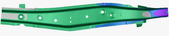 (2)根據零件的特點(diǎn)和前期CAE分析得出的回彈結果,制定合理的回彈補償方案,并運用CAE反向回彈補償技術(shù)對模具型面進(jìn)行補償,補償后CAE驗證回彈均在要求的+-0.5mm之內,有效的解決高強度鋼板回彈大的問(wèn)題;