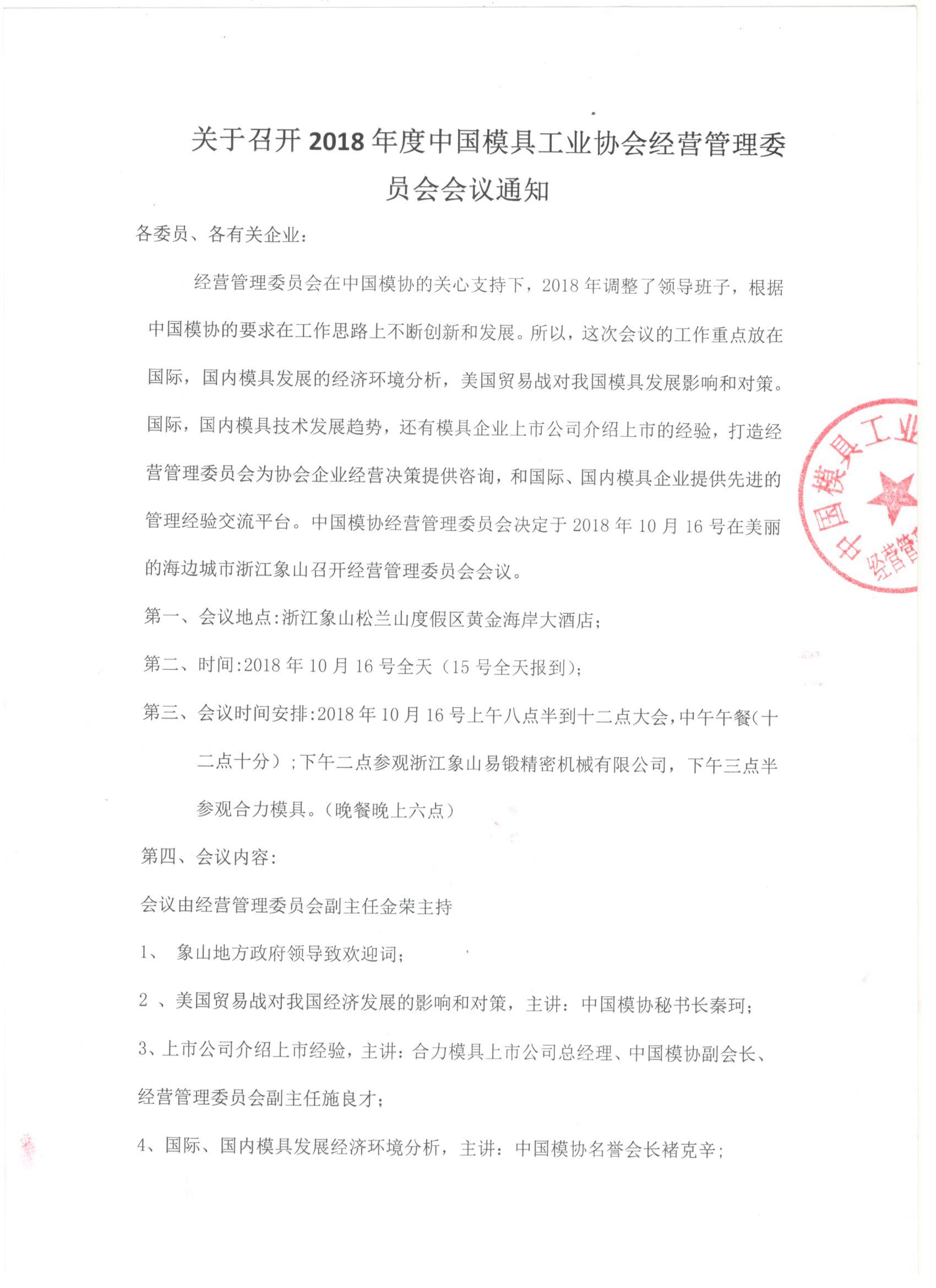 關(guān)于召開(kāi)2018年度中國模具工業(yè)協(xié)會(huì )經(jīng)營(yíng)管理委員會(huì )會(huì )議通知
