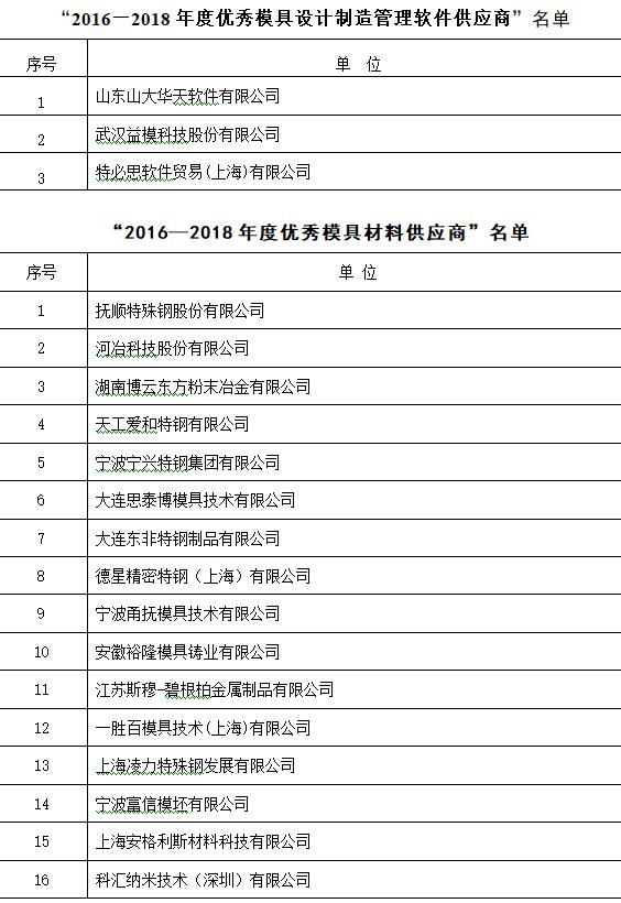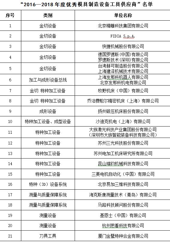 在知名品牌專(zhuān)業(yè)展會(huì )——中國國際模具技術(shù)和設備展覽會(huì )DMC上開(kāi)展優(yōu)秀供應商的評選活動(dòng),得到了各行業(yè)的廣泛認可,被評定為優(yōu)秀供應商的企業(yè),將在模具企業(yè)的采購中獲得優(yōu)先推薦資格并在行業(yè)里得到廣泛的宣傳推廣,并在中國模協(xié)的官網(wǎng)上進(jìn)行公告,至今已成定式。DMC2018期間,中國模具工業(yè)協(xié)會(huì )委托中國模協(xié)裝備委員會(huì )、數字化信息化委員會(huì )、材料委員會(huì ),本著(zhù)自愿的原則,依據供應商的技術(shù)水平、在模具行業(yè)的服務(wù)能力、市場(chǎng)占有率的高低、模具行業(yè)服務(wù)滿(mǎn)意度等行業(yè)貢獻指標,并結合模具企業(yè)的意見(jiàn),最終評選出21家“2016—2018年度優(yōu)秀模具制造設備工具供應商”、3家“2016—2018年度優(yōu)秀模具設計制造管理軟件供應商”、16家“2016—2018年度優(yōu)秀模具材料供應商”(同時(shí)見(jiàn)www.nyhezs.com,diemouldchina.com.cn),具體名單如下所示,排名均不分先后。