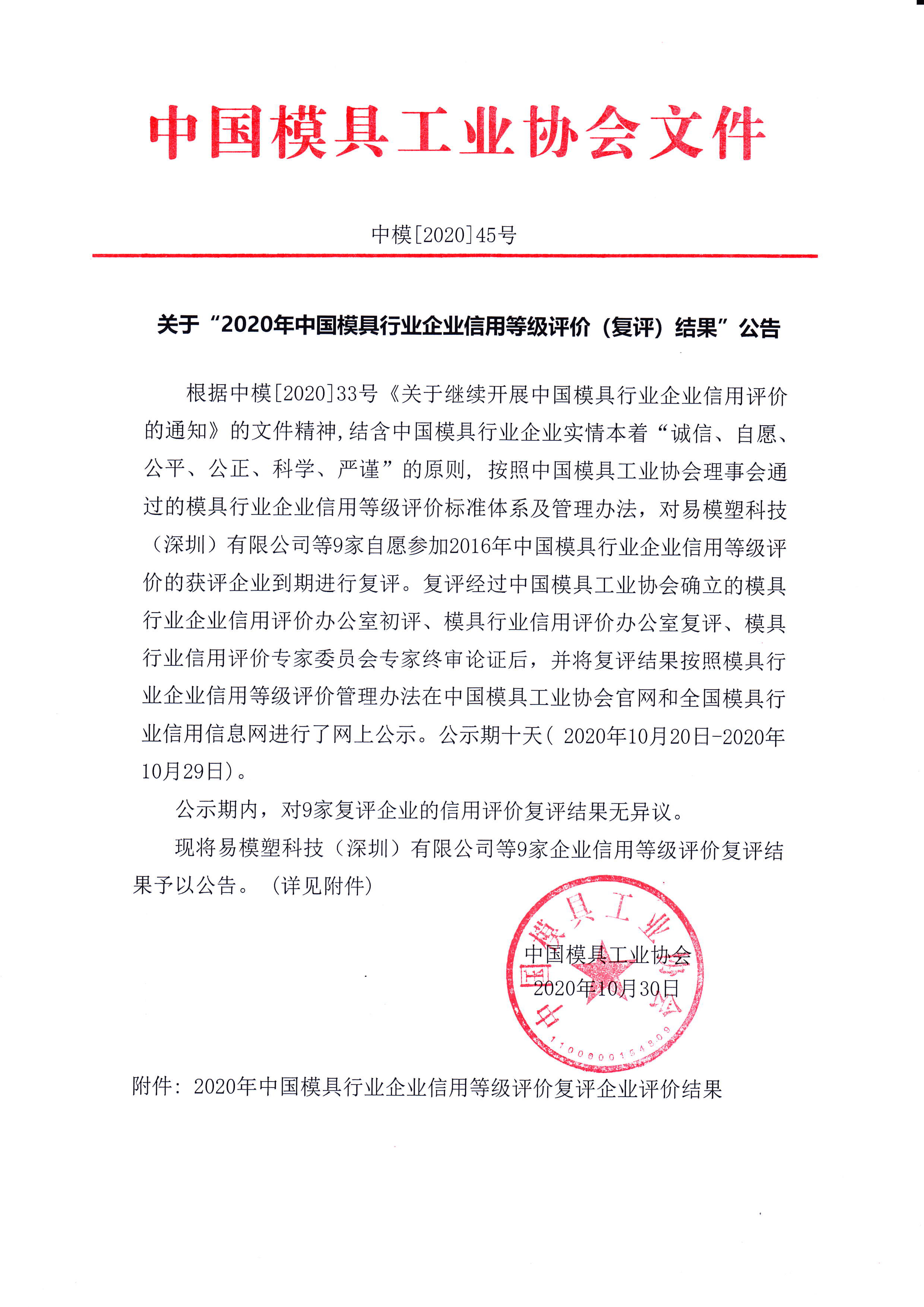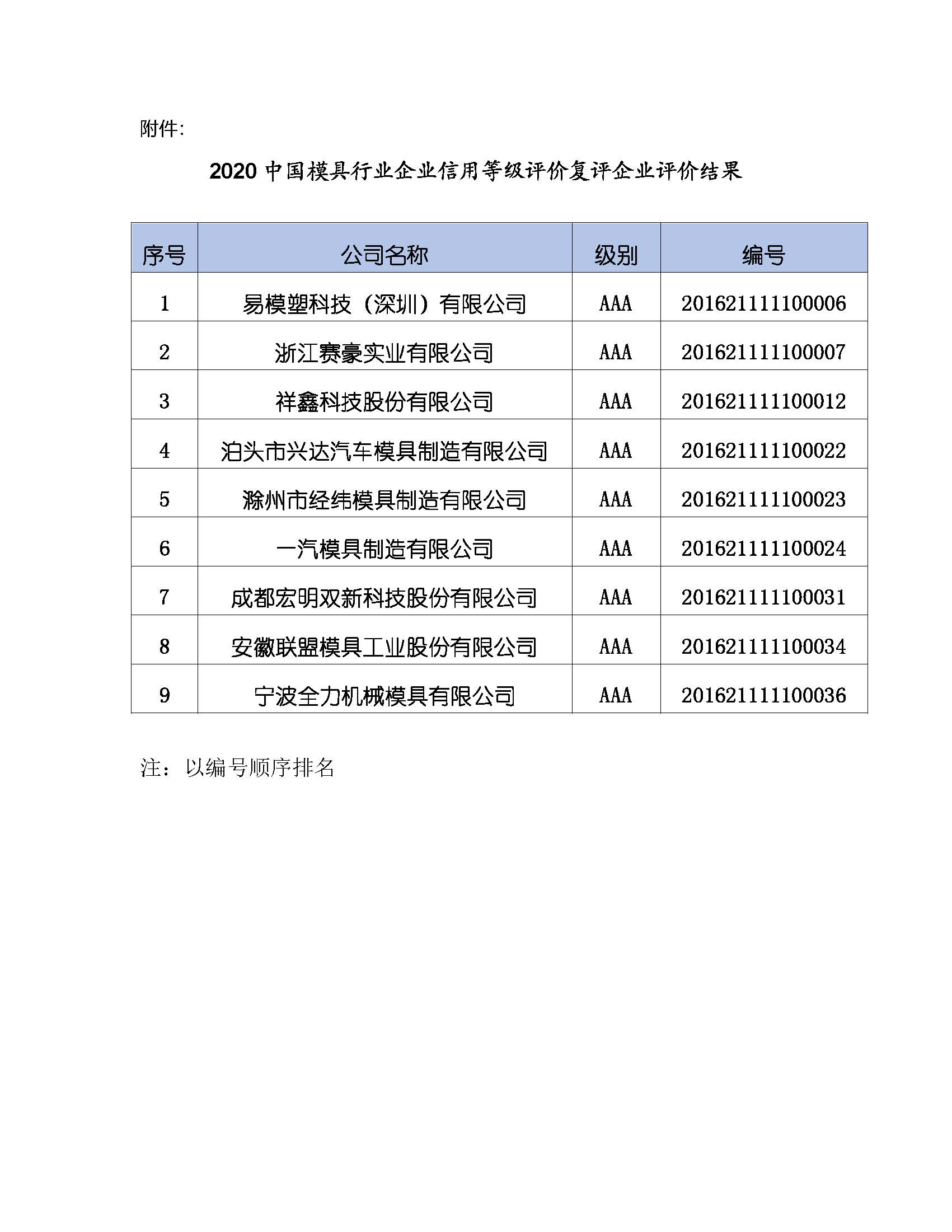 關(guān)于“2020年中國模具行業(yè)企業(yè)信用等級評價(jià)(復評)結果”公告