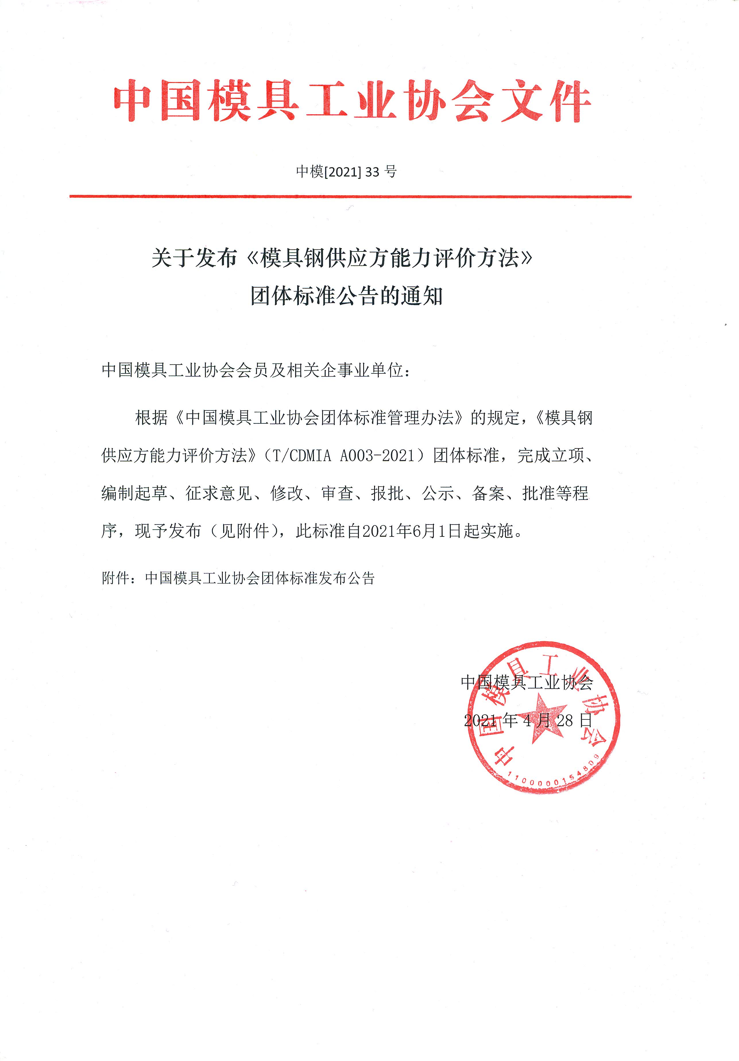 關(guān)于發(fā)布《模具鋼供應方能力評價(jià)方法》團體標準公告的通知