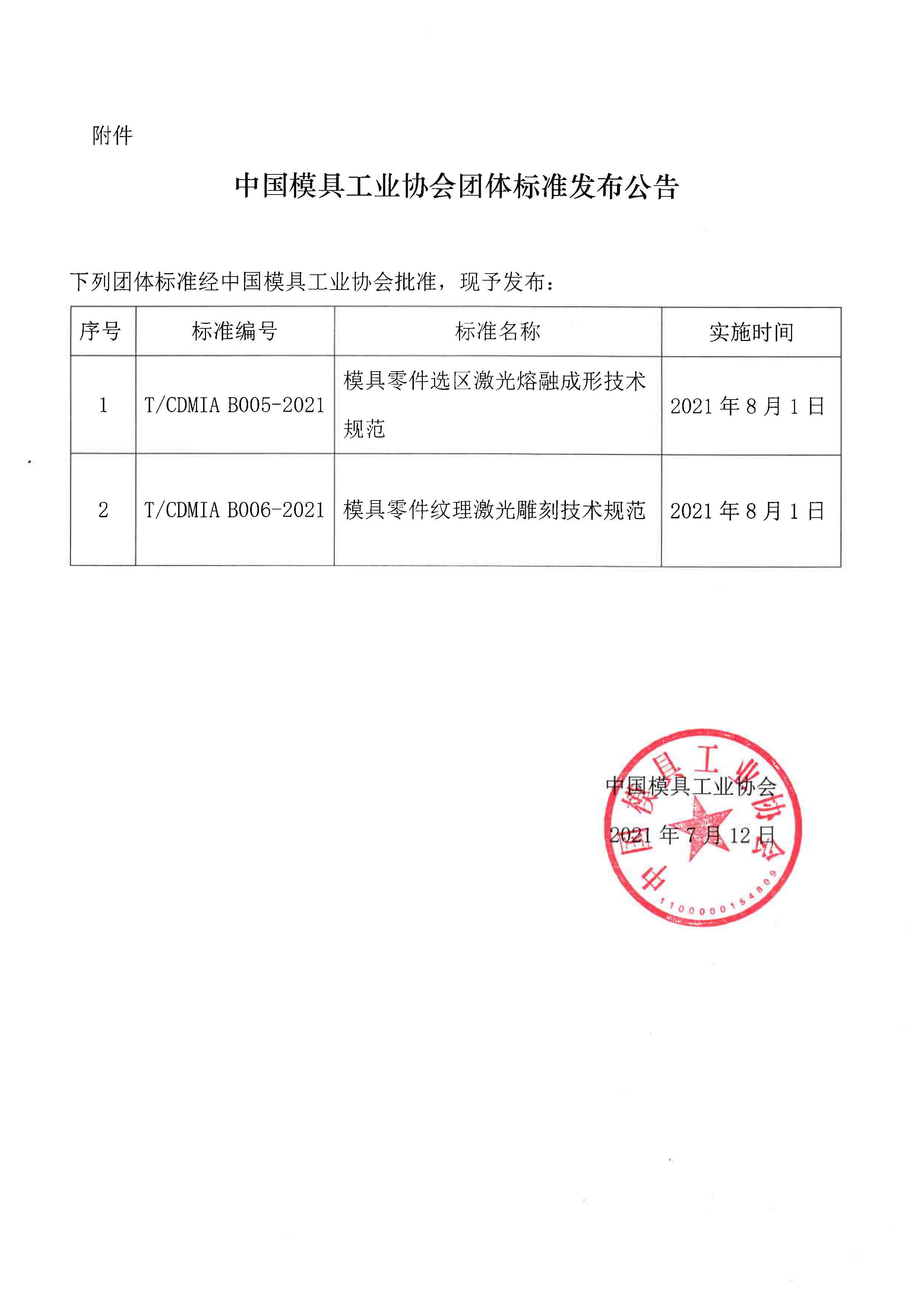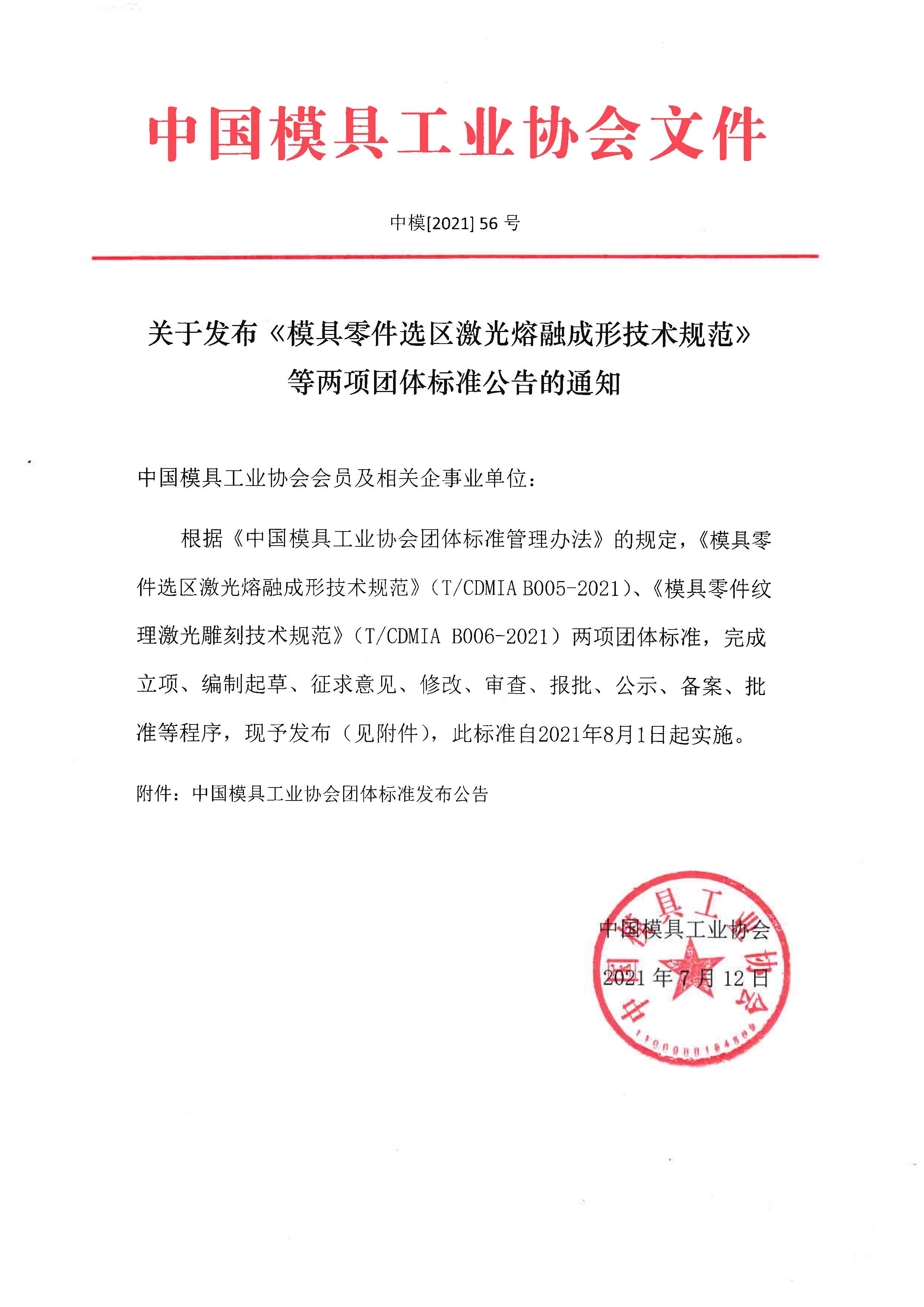 關(guān)于發(fā)布《模具零件選區激光熔融成形技術(shù)規范》等兩項團體標準公告的通知