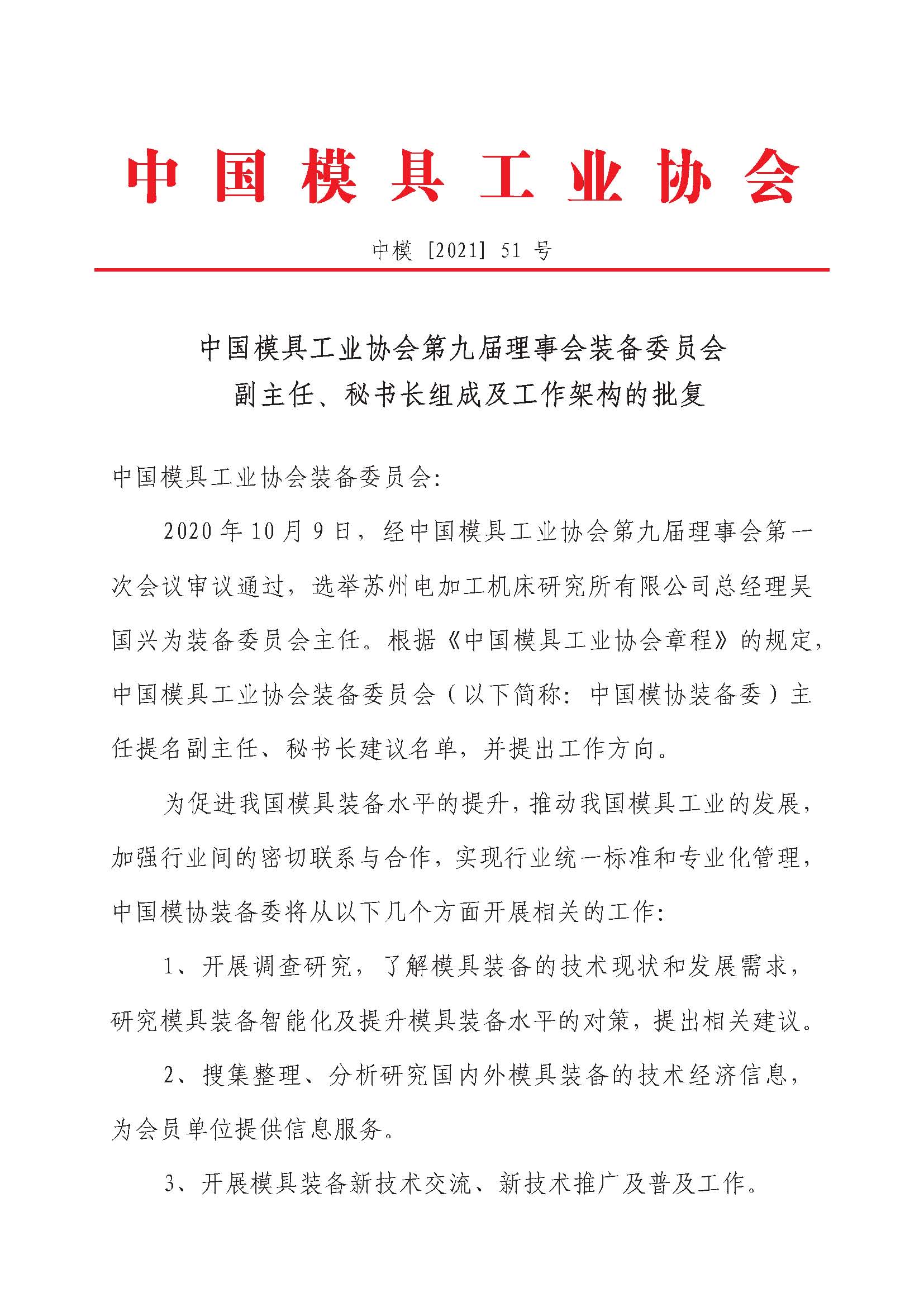 中國模協(xié)第九屆理事會(huì )裝備委員會(huì )副主任、秘書(shū)長(cháng)組成及工作架構的批復