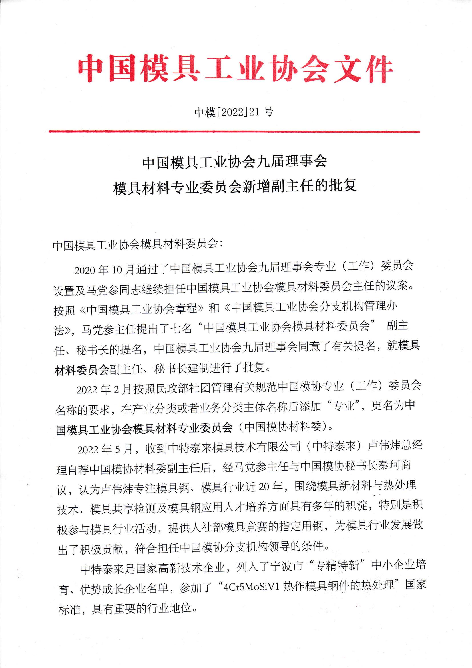 模具材料專(zhuān)業(yè)委員會(huì )新增副主任的批復