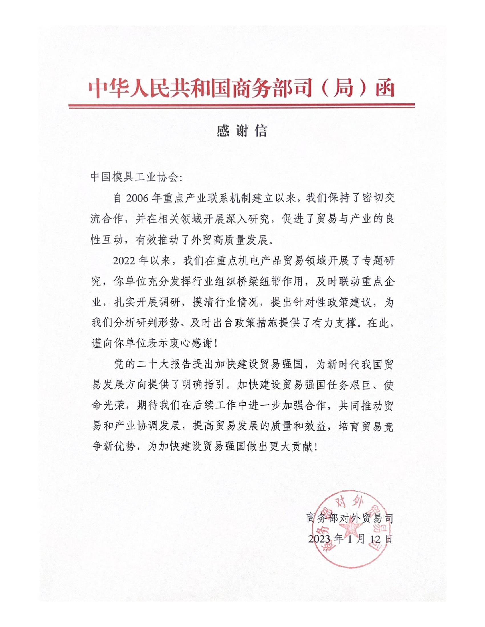 商務(wù)部對外貿易司致中國模協(xié)感謝信