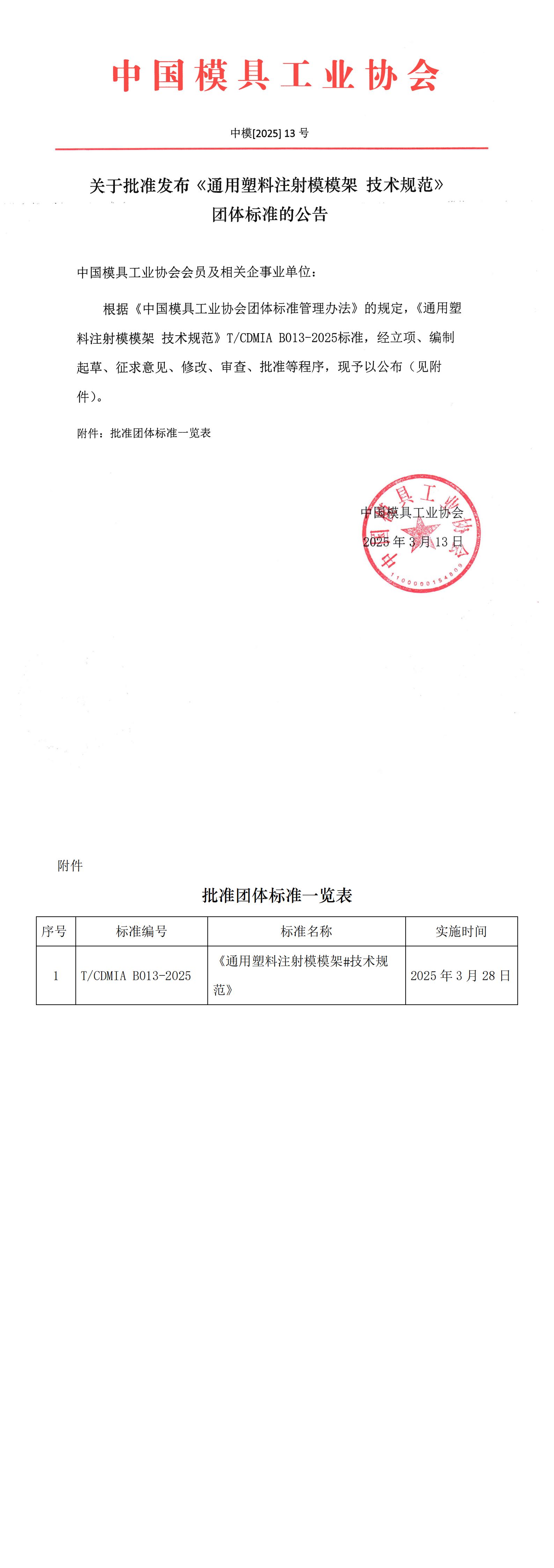 關(guān)于批準發(fā)布《通用塑料注射模模架 技術(shù)規范》團體標準的公告